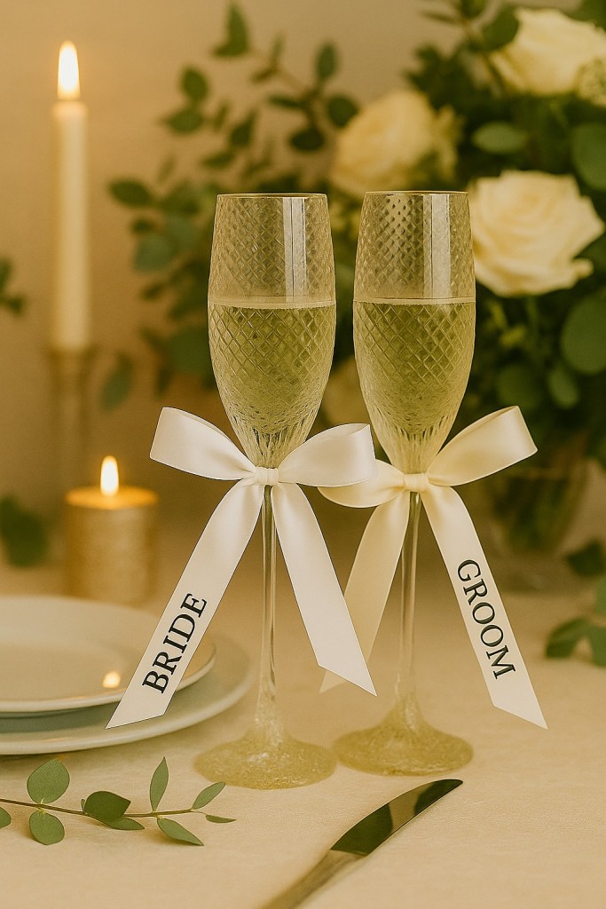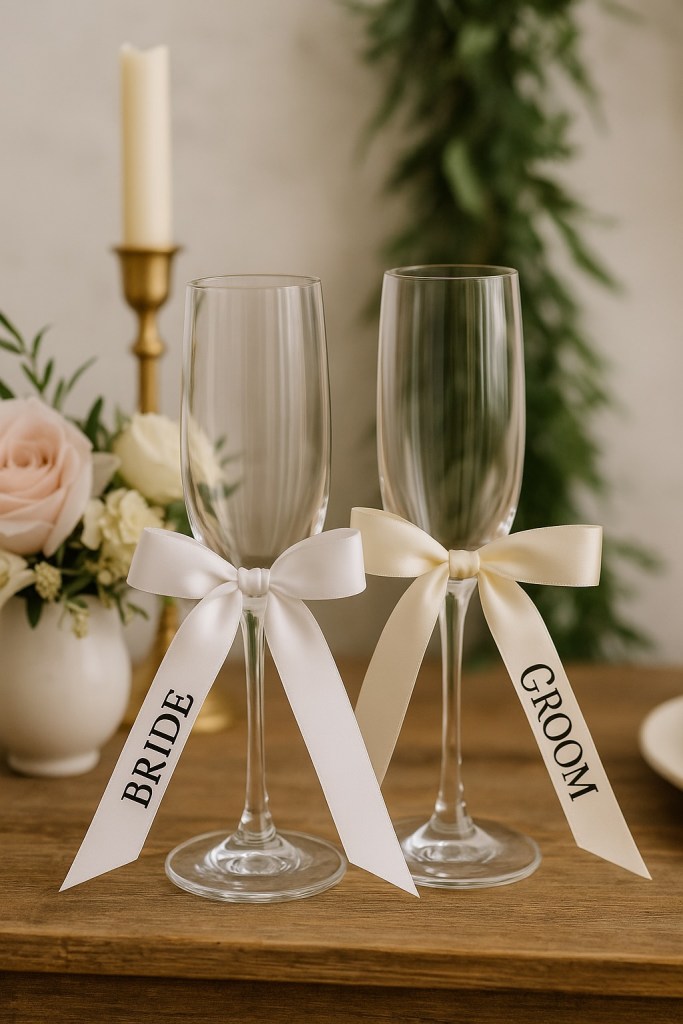 Add a touch of elegance to your celebration with our versatile ribbon accents! Use them to add a personalized detail to your bridal party outfits, mark glasses for a toast, or incorporate into your décor for an extra-special touch. The options are endless!